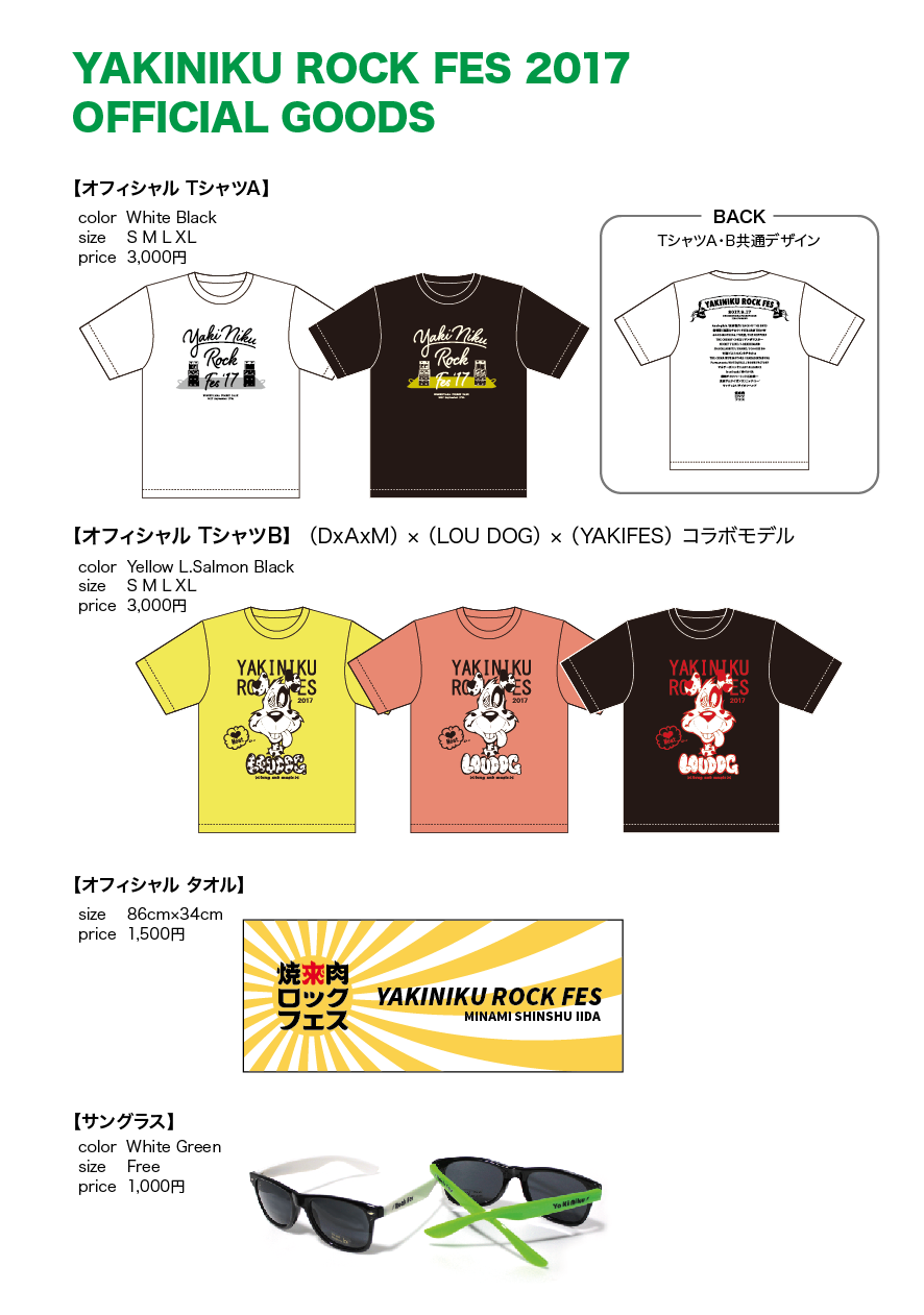 DATA:2017.09.07 Thu CATEGORY お知らせ 【ヤキフェス2017 オフィシャルグッズ情報解禁!】 焼來肉ロックフェス2017のオフィシャルグッズをご紹介します! ■オフィシャルTシャツ 今年はヤキフェス2017 オリジナルTシャツに加え、 「D×A×M」×「LOU DOG」×「YAKIFES」のマニアにはたまらないコラボモデルも販売決定! ■オフィシャルタオル ■サングラス オフィシャルグッズでヤキフェスの肉と音をとことん楽しみましょう! 数に限りがございますので、お早めにお買い求めください。 Tweet « 前のページYAKIFES BLOG 一覧へ次のページ »